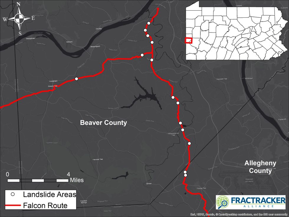 In its permit application, Shell identified "landslide risk" areas along the proposed route for the Falcon Pipeline. The FracTracker Alliance, a Pittsburgh-based oil and gas industry watchdog group, has mapped those locations. In Pennsylvania, the 14 landslide-prone areas on or near the proposed pipeline route total 2.1 miles.