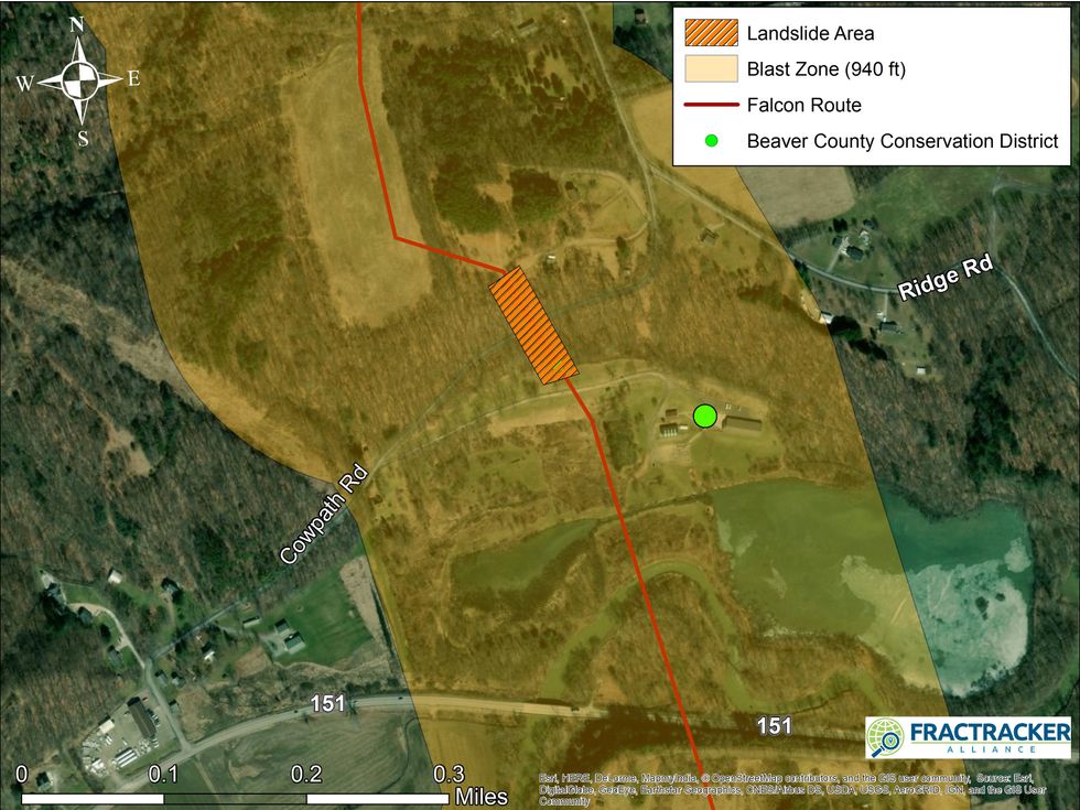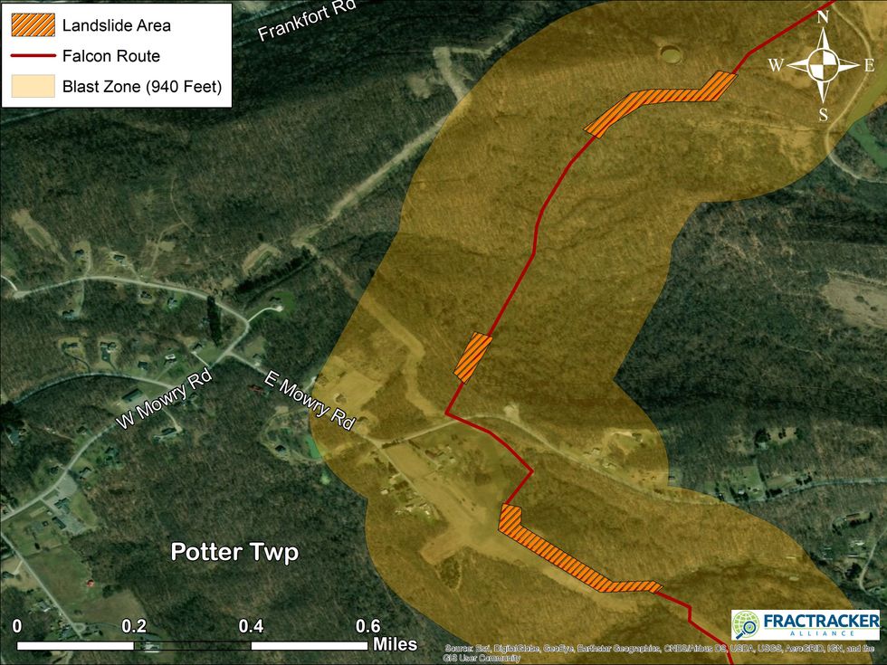"According to our analysis, the blast radius for the Falcon pipeline there is about 900 feet, so if there were an accident, all those homes are in the impact radius near the landslide area," Kirk Jalbert, a science and technology researcher and assistant professor at Arizona State University, told EHN. Jalbert previously served on the Pennsylvania Department of Environmental Protection's (DEP) Environmental Justice Advisory Board, and as Manager of Community-Based Research and Engagement for the FracTracker Alliance.