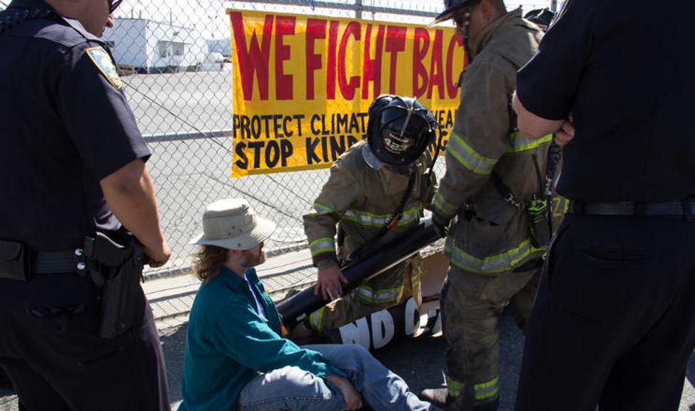 Protestors block the gates of the Kinder Morgan Richmond Terminal in Richmond, California. (Credit: Peg Hunter/flickr)