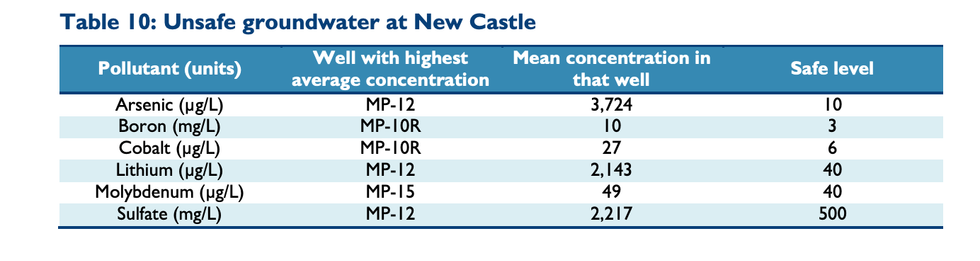 The researchers discovered arsenic levels of 3,724 micrograms per liter in groundwater at the New Castle Generating Station site—enough to cause cancer in one out of six people exposed to that level of the pollutant. The EPA's maximum contaminant level used under the Safe Drinking Water Act is 10 micrograms per liter.
