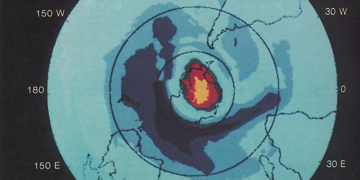 At an August 1985 meeting in Prague, atmospheric scientist Pawan Bhartia presented this satellite-based image that revealed for the first time the size and magnitude of the Antarctic ozone hole. (NASA)