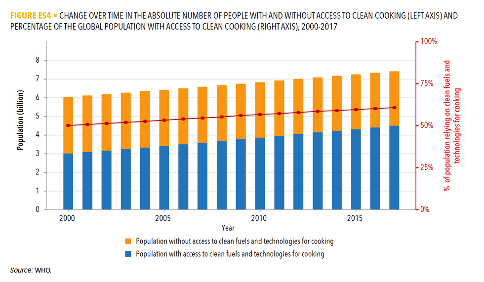 The percentage of the population with access to clean cooking fuels actually increased from 57 percent in 2010 to 61 percent in 2017, but the gains were offset by population growth.