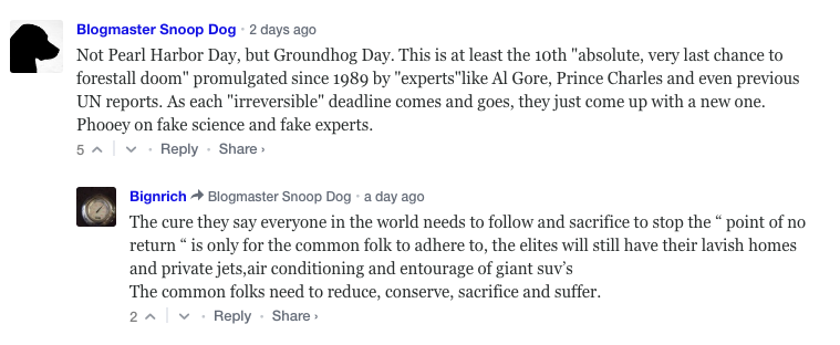 Several noted, like "Blogmaster Snoop Dog," that this is the umpteenth dire warning from scientists on topics ranging from population to global cooling to the disappearance of trees to, yes, climate change. And a comment from "Sailor12" suggests these scientific assessments aren't changing too many minds: