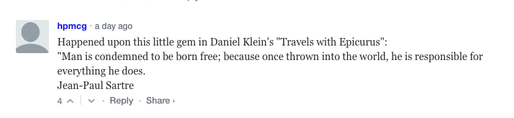 Of course, the Press Herald's comments are downright polite by today's Internet standards—and feel remarkably civil compared to comment strings following, say, any article on Breitbart.com. The discussion included references to the Enlightenment and existentialism; "hpmcg" quoted Sartre, prompting "todiscus" to offer his or her own two cents: