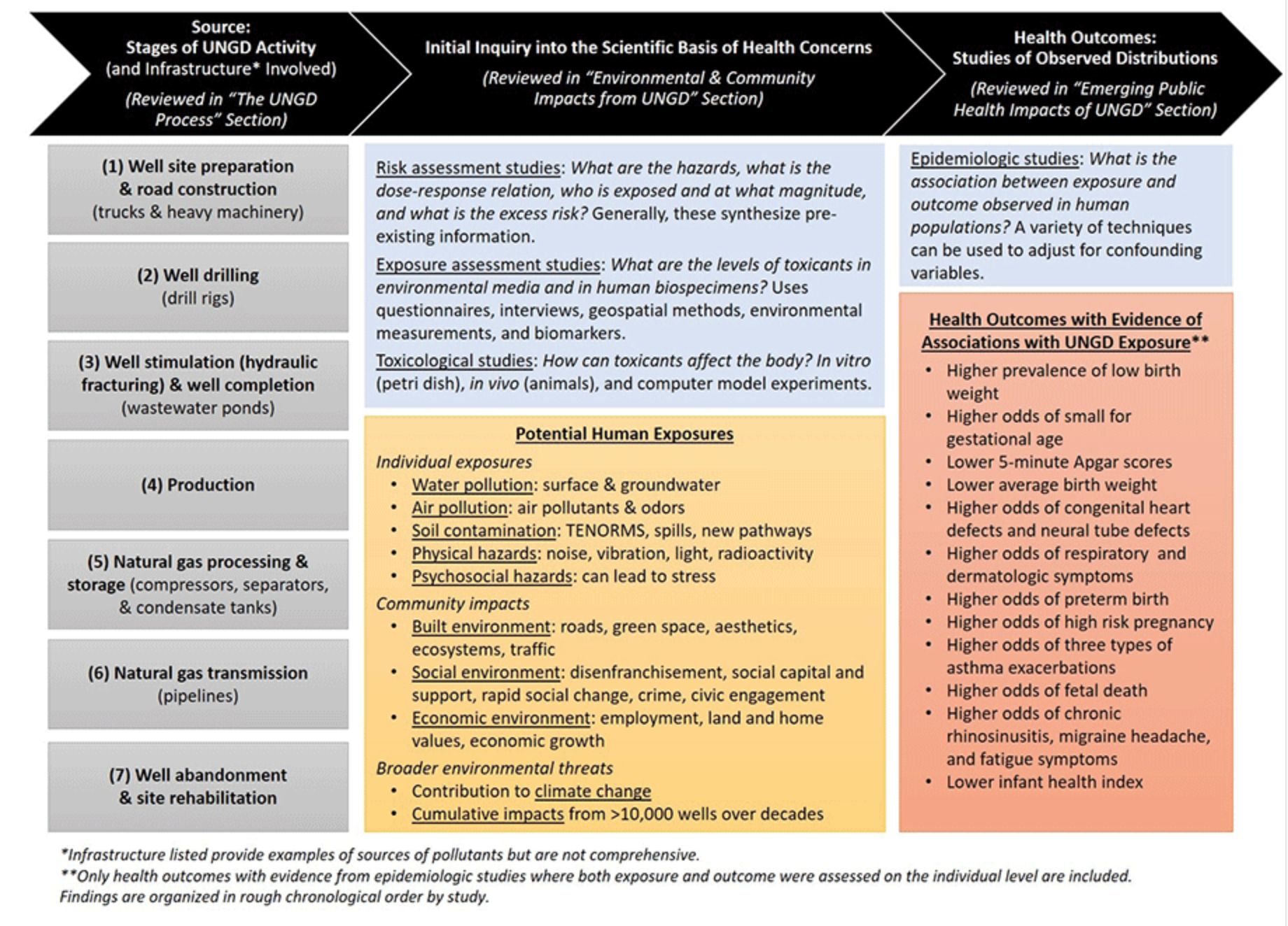 They found evidence that water pollution, air pollution, and soil contamination caused by the industry have been linked to adverse health impacts through both exposure to toxic chemicals released during fracking, and through increased stress and anxiety caused by the increased light, noise, and truck traffic associated with fracking.