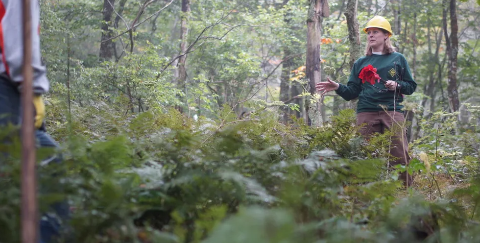 North Carolina biologist Chris Kelly with flags to mark planting sites as a part of an effort to restore red spruce in the Southern Appalachians. (Credit: USFWS)