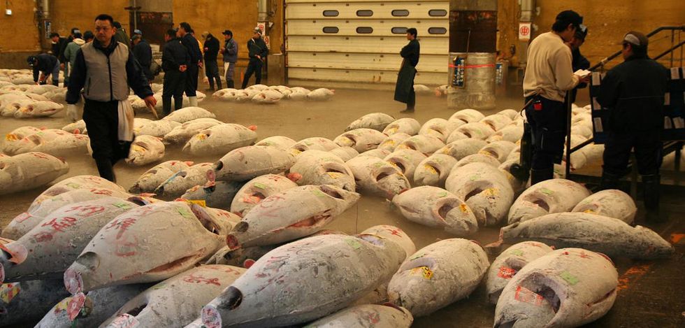 Frozen Bluefin Tuna ready for auction at Tsukiji Market in Tokyo. (Credit: Matt Saunders/flickr)
