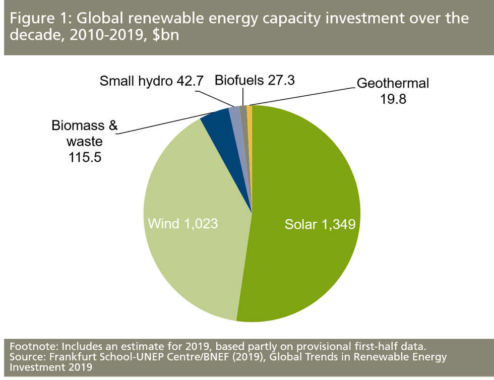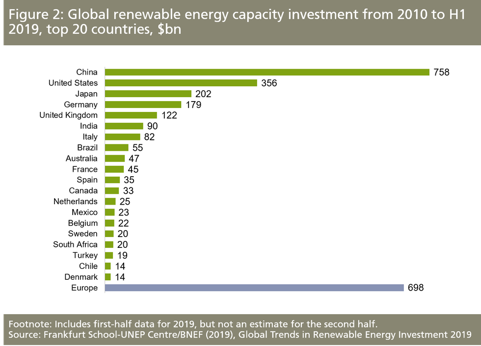 Total investment over the past decade was roughly $2.6 trillion, with half of that dedicated to solar. China led the way in renewable investment, committing about $758 billion between 2010 and early 2019. The U.S. was second to China, committing less than half that amount over the same time—$356 billion.