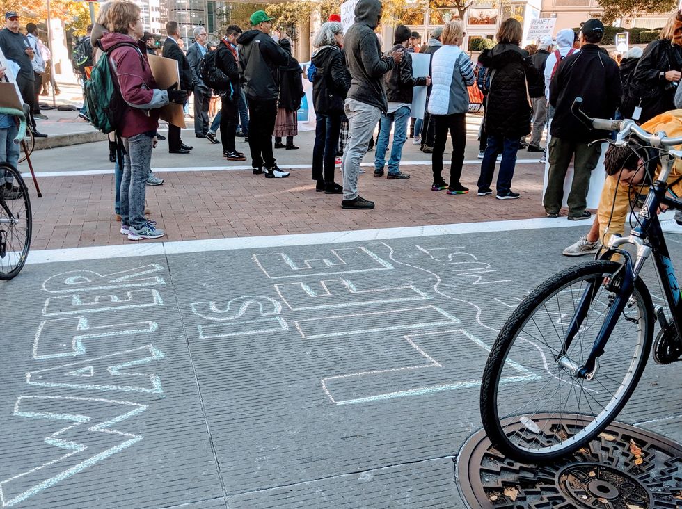 Immediately following the environmental rally, Women's March protesters and Trump supporters filled the street outside the convention center. The opposing groups were kept separate by a line of police officers.