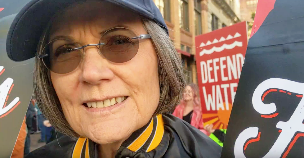 "We believe it's not a question of good jobs or the environment," Barbara White Stack, a 65-year-old member of the United Steelworker's Union (USW) who attended the protest, told EHN while a tribal leader sang a native prayer song over the loudspeaker at the front of the rally. "It's not one or the other. It has to be both. Workers and their families need a clean environment to survive."